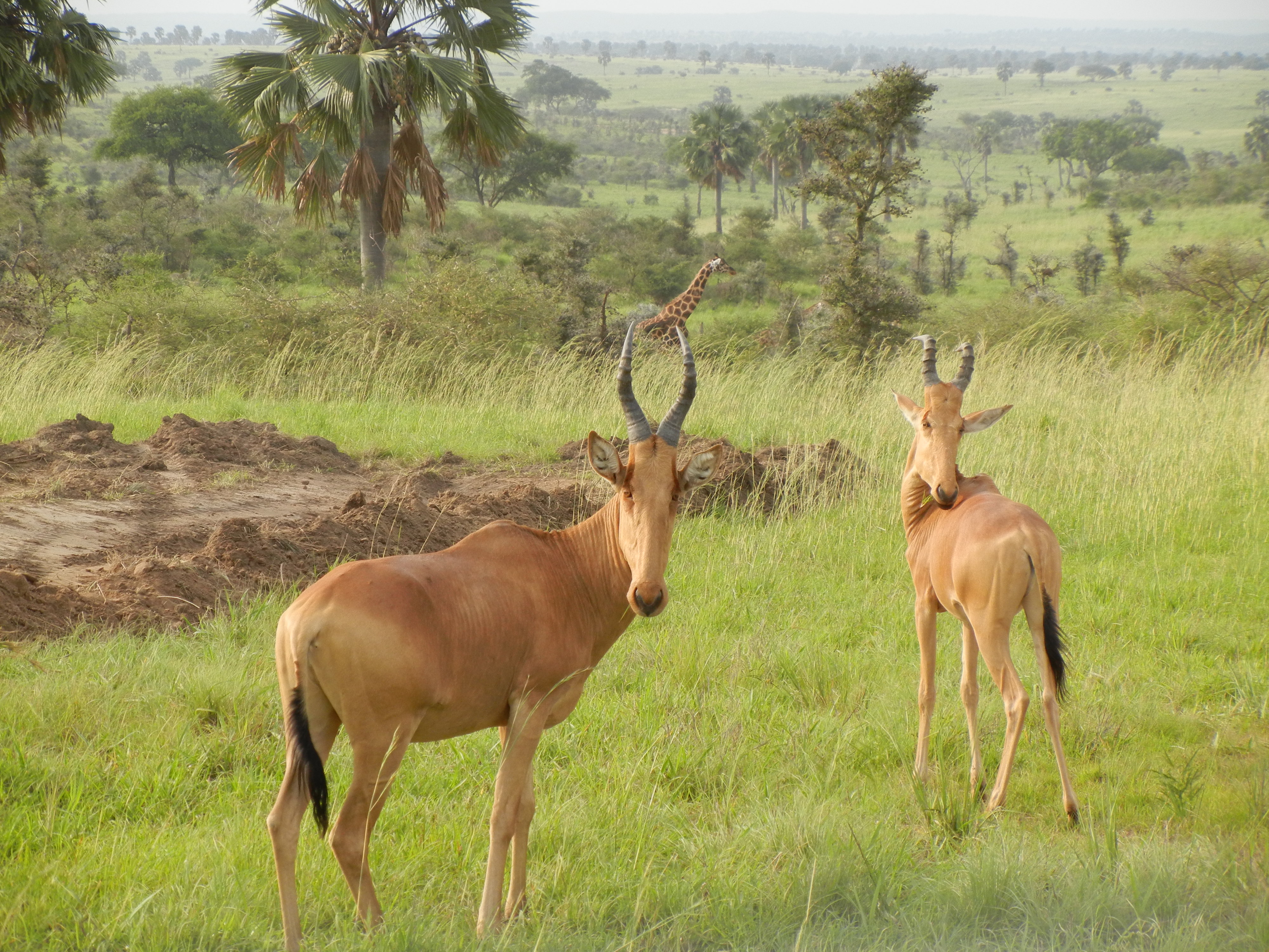 Knowing that by this time our research would almost done, we planned for a respite at Murchison National Park in Uganda.  I don’t think I told you that there are now 7 of us doing work in Masindi.  Dr. Godlove Fonjweng, the Director of Global Education at Wilkes joined Joe and me for our initial trip to Masindi and has been helping do the village interviews for my project.  Four others joined us to conduct their own project regarding the impact of safe water on the community- another faculty member and a recent alumni from Wilkes along with a faculty members from two other colleges in the Wilkes-Barre, PA area.  So all 7 of us left Masindi this morning to travel about 2 hours north to the park and now we just got back from our first Game Drive.  Wow, it was totally fantastic!  The landscape was just beautiful with numerous shades of green that transitioned from woodland savannah to grassland savannah and back again.  The land was covered with long grasses, a variety of bushes along with Acacia trees and Palm trees.  The latter is not indigenous to this area but we were told that the Palm tree seeds were brought to Murchison by migrating elephant herds from the Sudan via their feces many years ago.  Now the trees are all over and from a distance the scene reminded me of the picture of the Truffula Trees in the book by Dr. Seuss, The Lorax.  We actually started seeing animals on our way in into the park; as we drove along we would see baboons sitting all over the road ahead. Our driver slowed down and so we could try to catch them in a picture.  Once the Game Drive started, though, the animals became more prominent.  We saw all kinds of “antelope-related” creatures, warthogs, buffalo, giraffe and elephants.  It was so amazing!  Our van had a roof that popped up so we could stand up and take picture unencumbered by windows.  I will attach some below.  I hope to be able to figure out exactly what the animals are called tomorrow.  We are taking a boat ride down the Nile River in the morning and then plan to hike up to the falls and then another Game Drive in the afternoon.  Oh, I forgot to tell you that we drove to the top of Murchison Falls even before we got to our hotel.  It was a beautiful site.  The pictures will look a little “foggy” because the spray from the water was so strong.  I have been trying to load pics for a little while now but the connection is so slow. I will post one so you can share some of my excitement but you’ll have to wait until tomorrow for more.