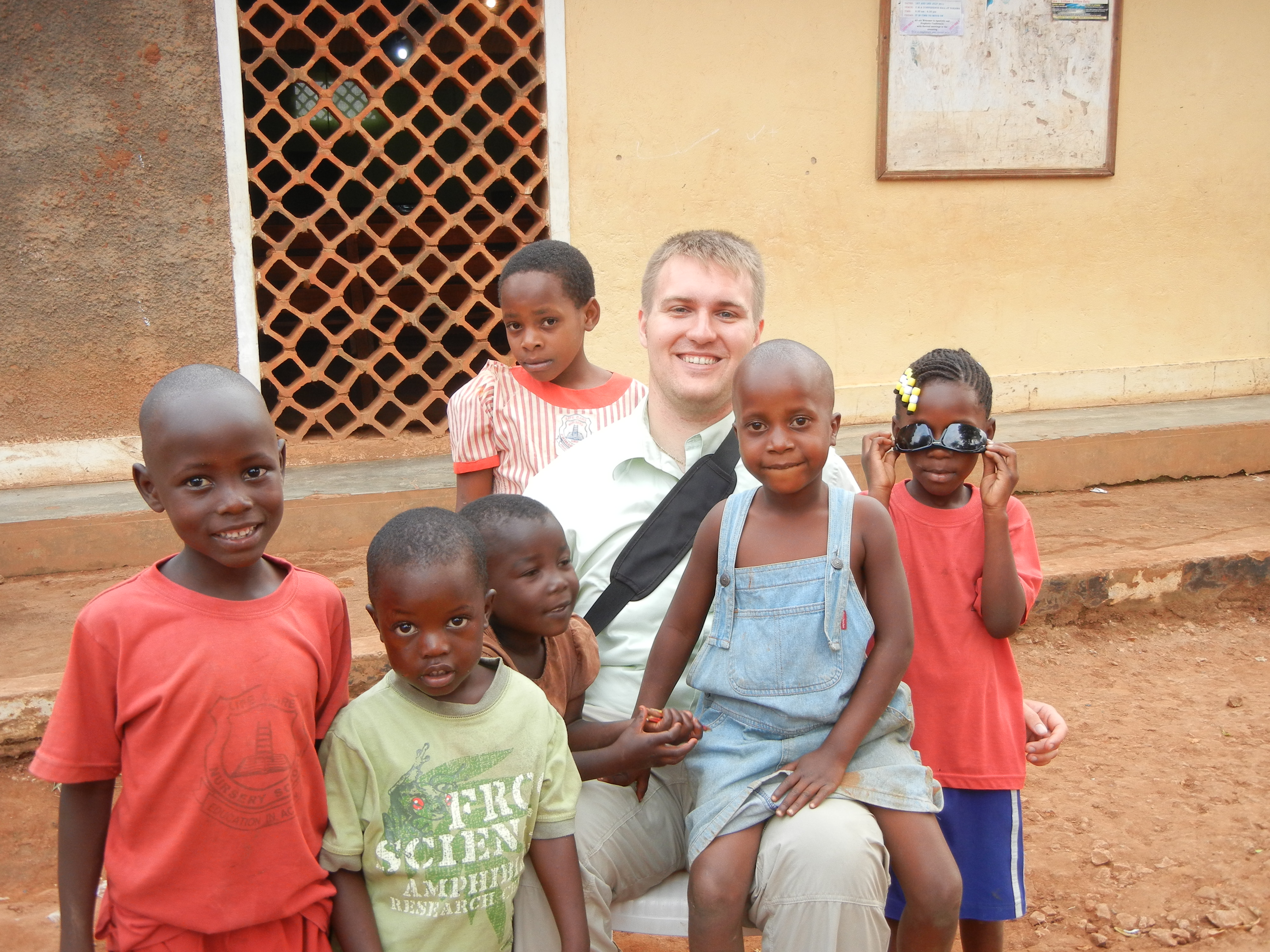 Joe surrounded by happy children from Lifecare Primary School at Bwaise Church