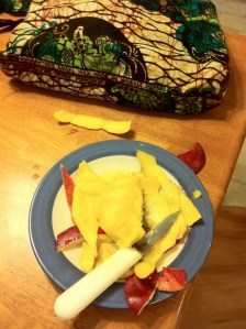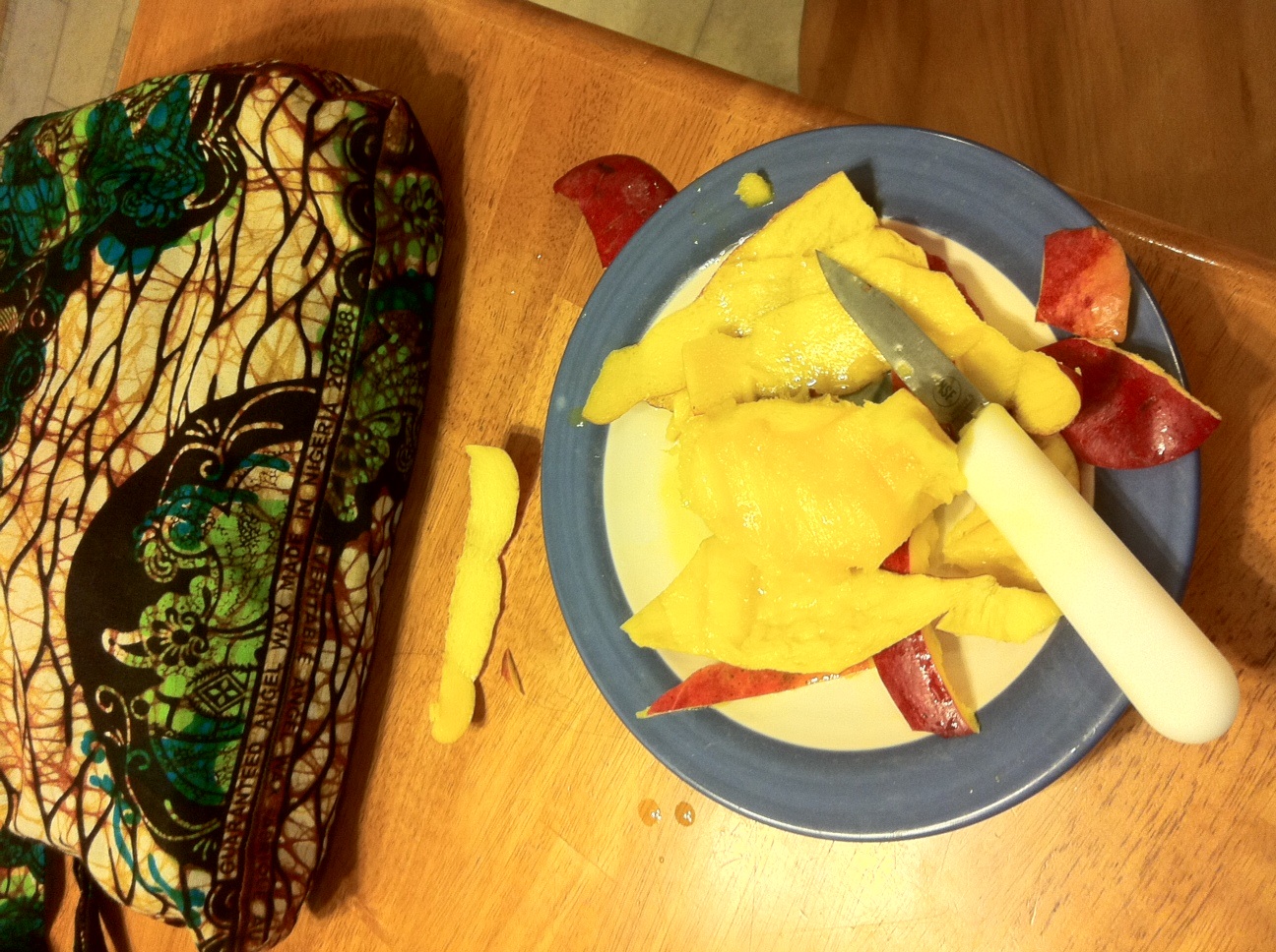 There is not much left of the mango I ate this morning. The purse in the background was made in Karagwe, Tanzania