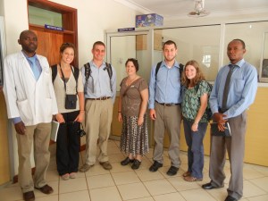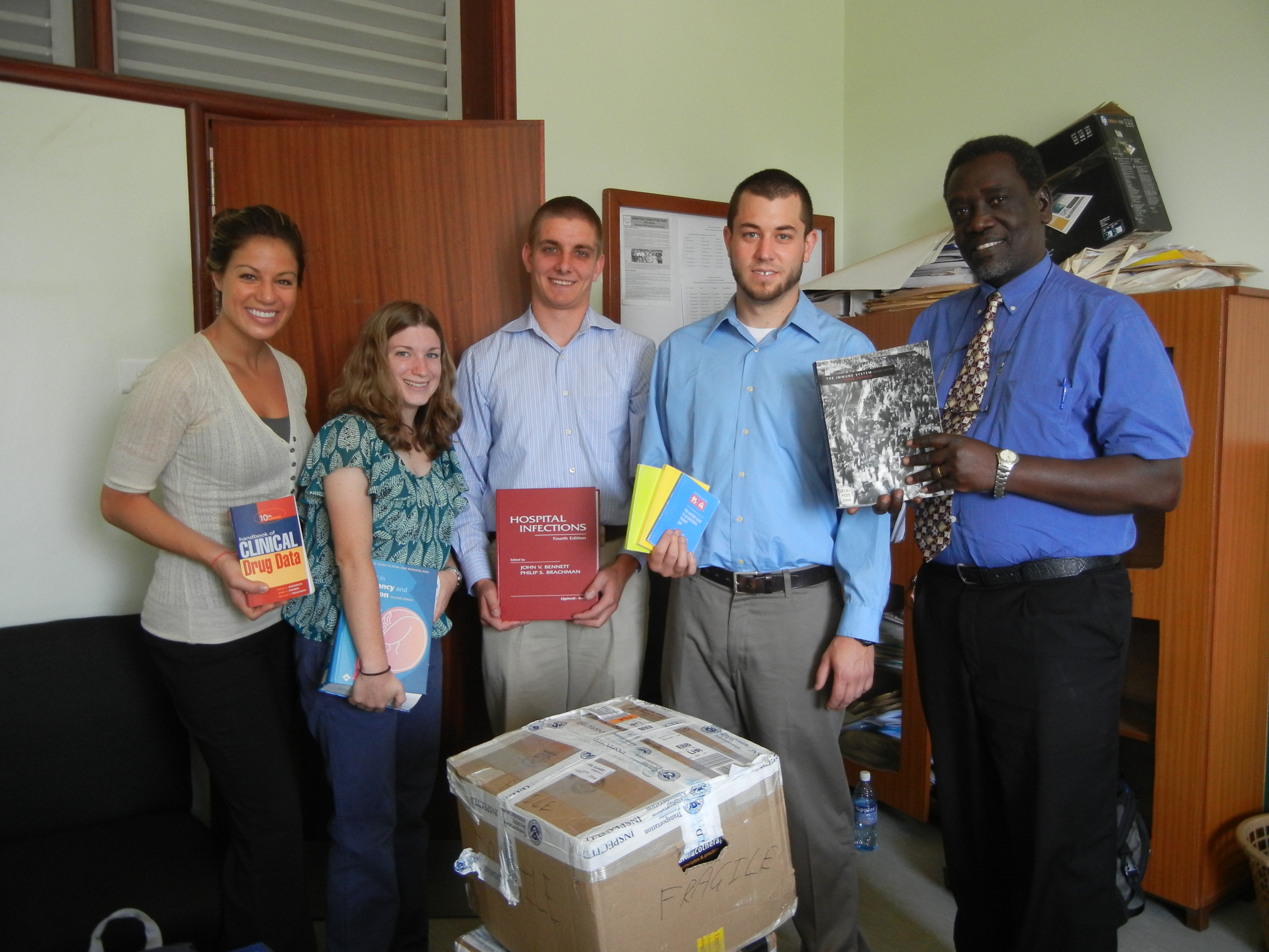 It is now Tuesday, Sept 11 at 6:30pm and we are now settling in and getting used to life in Uganda. There are so many different things to experience here that initially it is easy to be overwhelmed with the new scenery, new smells, new noises (loud birds and monkeys) not to mention new people and languages. Although English is one of the National languages, and it is the “medical” language here, many people speak normally in non-English native dialects. It hasn’t been hard to communicate at all with the healthcare professionals we’ve met, but when it comes time to talk to patients, we may need to translators or defer the the Mulago staff for those interactions. Monday morning started off with a delicious breakfast provided by the Mulago Hospital Guest House consisting of fresh pineapple, eggs to order, toast, tea, and passion fruit juice. The Makerere Professor picked us up and brought us to the Pharmacy School where we were able to meet with two other faculty members and discuss plans for our time in Kampala. We also gave them the 200lbs of books that we had brought all the way from Wilkes University, which they were very happy to accept as shown in the picture above with Professor Odoi.