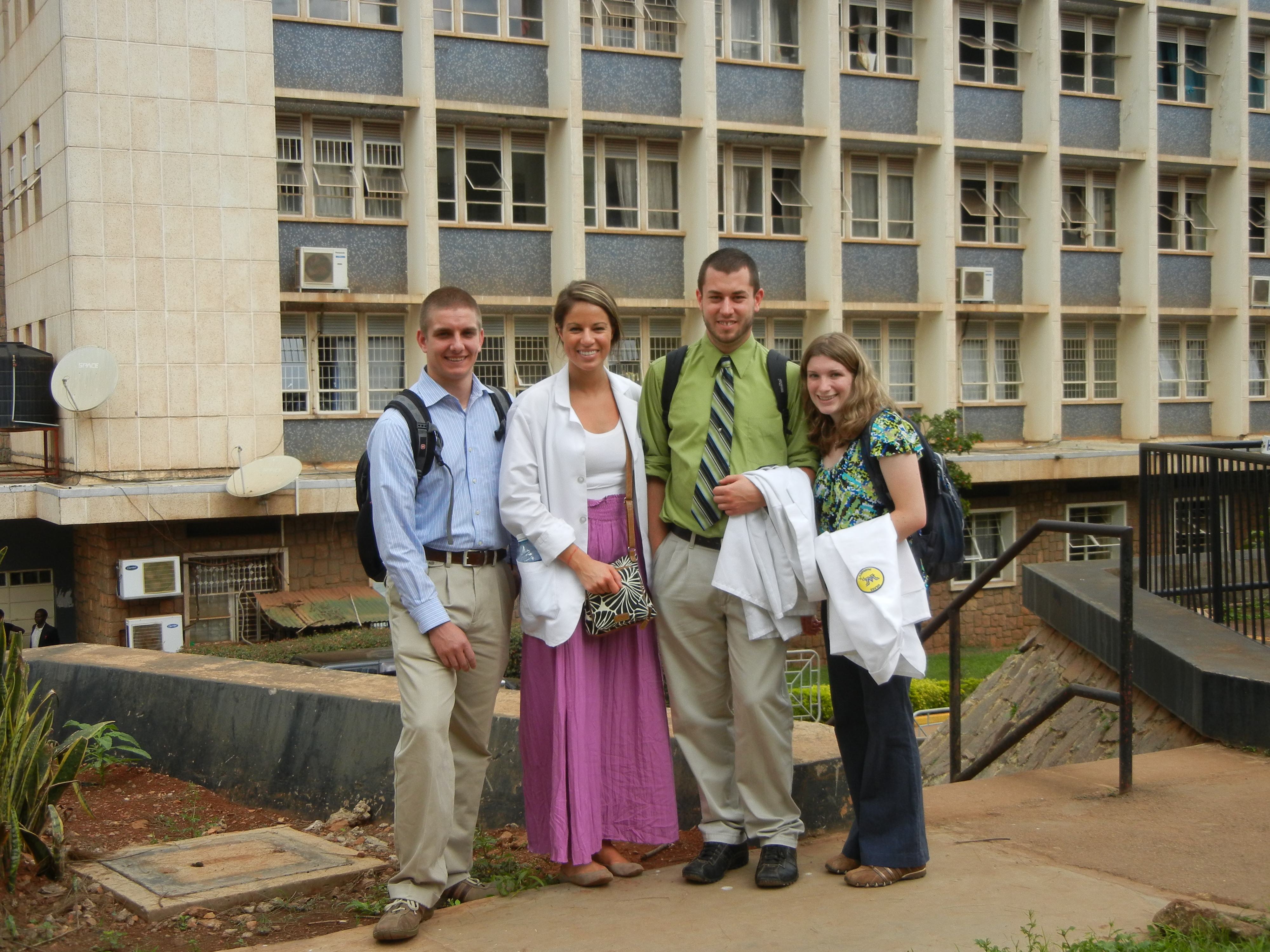 We had another interesting day at Mulago Hospital. Here is a picture of the students outside one of the side sections of the hospital. It really is quite large. The total number of inpatients every day is about 2000 but if you include the outpatients that flow through those clinics it can be up to 10,000 patients a day. Two of the students spent time on the pediatrics ward today and it turns out that it doesn’t even fit in the main hospital- it is up the hill. One of the most interesting things I’ve learned about Hospital Care in Uganda and Tanzania (the only 2 African countries I’ve experienced but I think all countries may be the same) is that patients need to bring a caregiver or “carer” with them to provide food and daily care like washing and cleaning the beds. The hospital doesn’t provide food for the patient and instead carers either purchase food for the patient or they bring the supplies and cook over campfires in the courtyards. They also wash the bed linens and you can see them drying all over the courtyard lawns. The nurses are so few and so busy that they are primarily responsible for taking vitals, changing wound dressings, and administering injection medications. This means that the pharmacy dispenses full prescriptions of oral meds (usually a week’s supply) to the patient’s caregiver in little baggies and they are the one responsible for giving them to the patient. I have wondered what we would do if this were the case in the US (in terms of having to bring a caregiver) because so many people aren’t close to their families and aren’t married. In Uganda, family and marriage is very important as is caring for your family at-large – “the community”. Having a caregiver with each patient has many benefits in that as a healthcare professional, we could always have someone to talk to about the patient to provide instructions or answer our questions, the patient always has an advocate, and basically both the patient and caregiver are getting training on the patient’s illness and treatments during the hospital stay and patient education doesn’t need to be saved for the day of discharge.