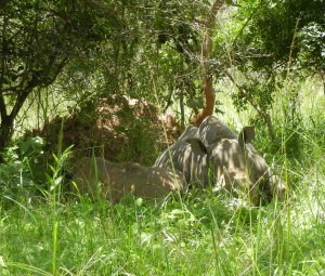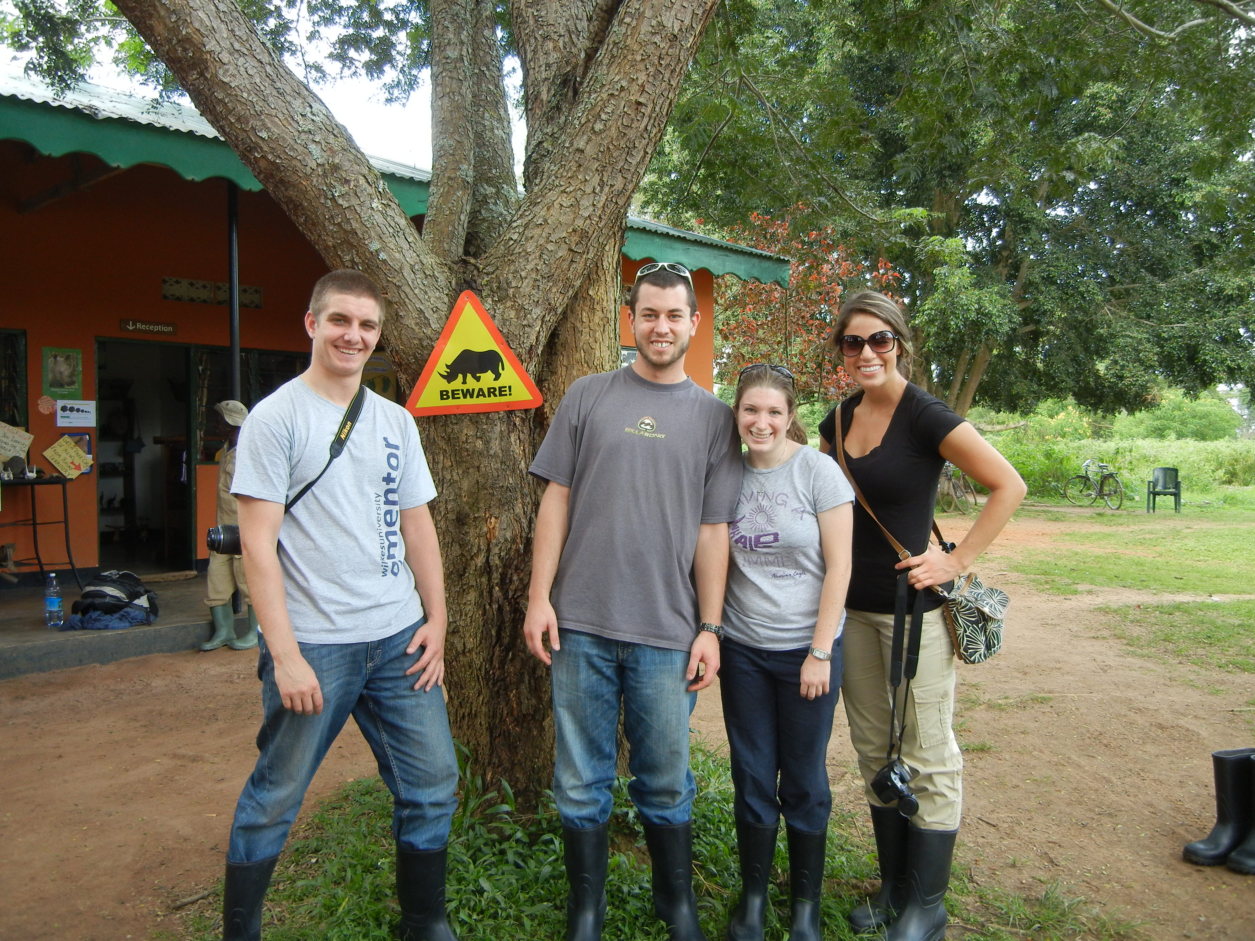Today we went to the Ziwa Rhino Sanctuary, which is about 1 hour outside of Masindi towards Kampala. The Rhino’s there are called White Rhinos but not because of their color. The animals are actually grey and the name is really describing their “wide” mouths. When they were originally named, the pronunciation of “wide” sounded like “white”, hence the name. Rhino’s are no longer living in the wild in Uganda due to poaching which led to extinction during the reign of Idi Amin. This sanctuary is building a herd, which can eventually be released in Murchison Falls National Park so they once again can inhabit their native land. When it says we are going to go Rhino “trekking”, they aren’t kidding. Following a guide, we hiked into the bush for about 30min or so through lots of swampy areas. For this reason we had to put on wader boots prior to the hike (notice the attractive footwear in the picture of the students). This made it just a tad more challenging to navigate the uneven ground in the wetland areas. In addition, the sun was bright and hot so we were all drenched in sweat by the time we found the Rhinos.