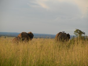 Although, we had already seen many amazing animals, we were determined to find elephants and lions, and our guide was willing to help us. We were told that the lions often stay in the brush during the daytime heat and do the majority of their hunting in the evenings and nights. We drove to several brush locations where the guide thought lions might be. Our drive drove the van right up next to a large brush area so that the branches were poking through our windows. The guide slid open our van door so we were able to peer through the brush, and sitting there were a male and female lion! It was too difficult to take pictures through the thick brush, but we were still happy to be able to say we saw two lions on our safari! As it began approaching sunset, we started to head back to the hotel, losing hope of seeing an elephant. When we were almost back, our guide pointed ahead to a herd of 4 elephants walking through the grassland. It looked like a photo; tiny birds were perched on the elephants’ back as they slowly marched ahead. The guide informed us that the birds weren’t just hitching a ride, but actually picked parasites off of the elephants’ back. We arrived back at the lodge around 7pm, our 4 hours of safari was very successful as well as exciting and tiring! After dinner we were all ready to get to bed and rest up for the next day’s adventures!