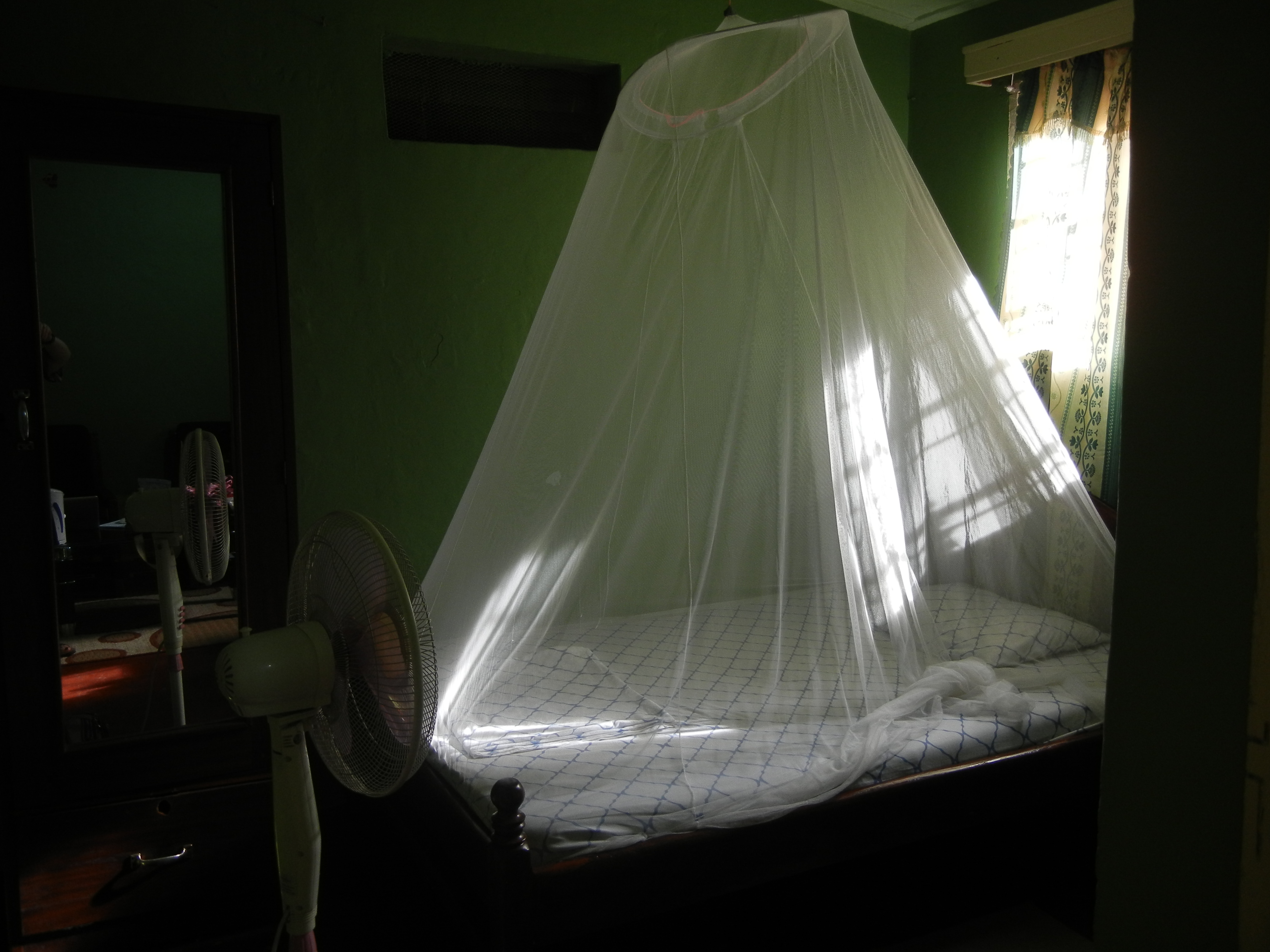 The bedroom has the requisite mosquito net and a closet with a mirror on the door. They even have a fan to keep me cool.