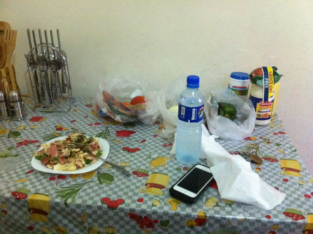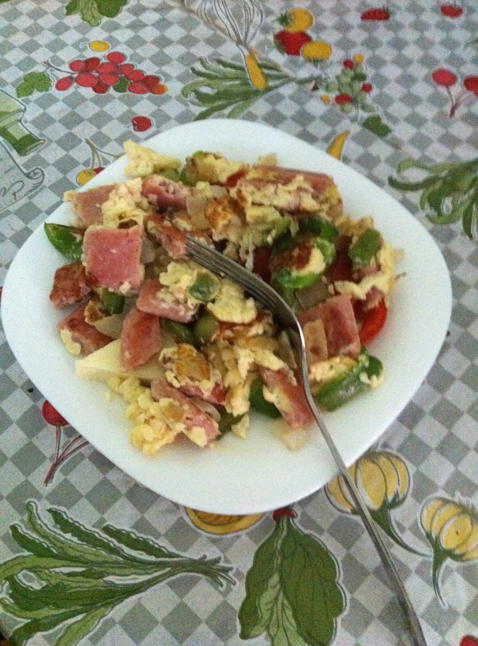 At the end of the day, Richard picks me up and takes me back to the Edge House. When I’m with the pharmacy students, we always look forward to going out to a nice dinner where we talk and debrief the experiences of the day. But for this trip, I’m on my own and dinner alone isn’t that enticing to me. I’m also on a stricter budget so I’ve been making my own simple dinners. For lunch I eat the local foods at one of the hospital canteens and that consists of rice with g-nut sauce (like a peanut sauce) and then sometime a beef or chicken sauce or just a bean sauce. So what do I cook for myself? Well, since I knew I would be cooking my own meals, I brought a couple of things from home just in case. In addition to the peanut butter I brought foil packs of tuna fish and Spam. Yes, spam. I thought that scrambled eggs would go great with the Spam so that along with some sliced tomatoes are a meal.