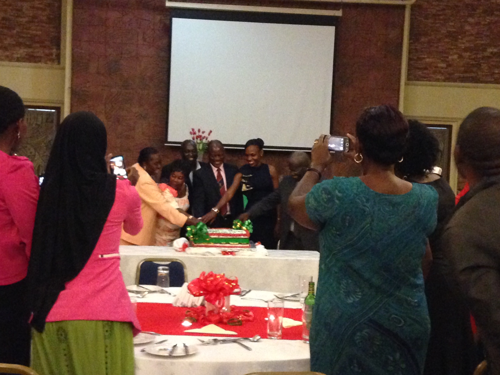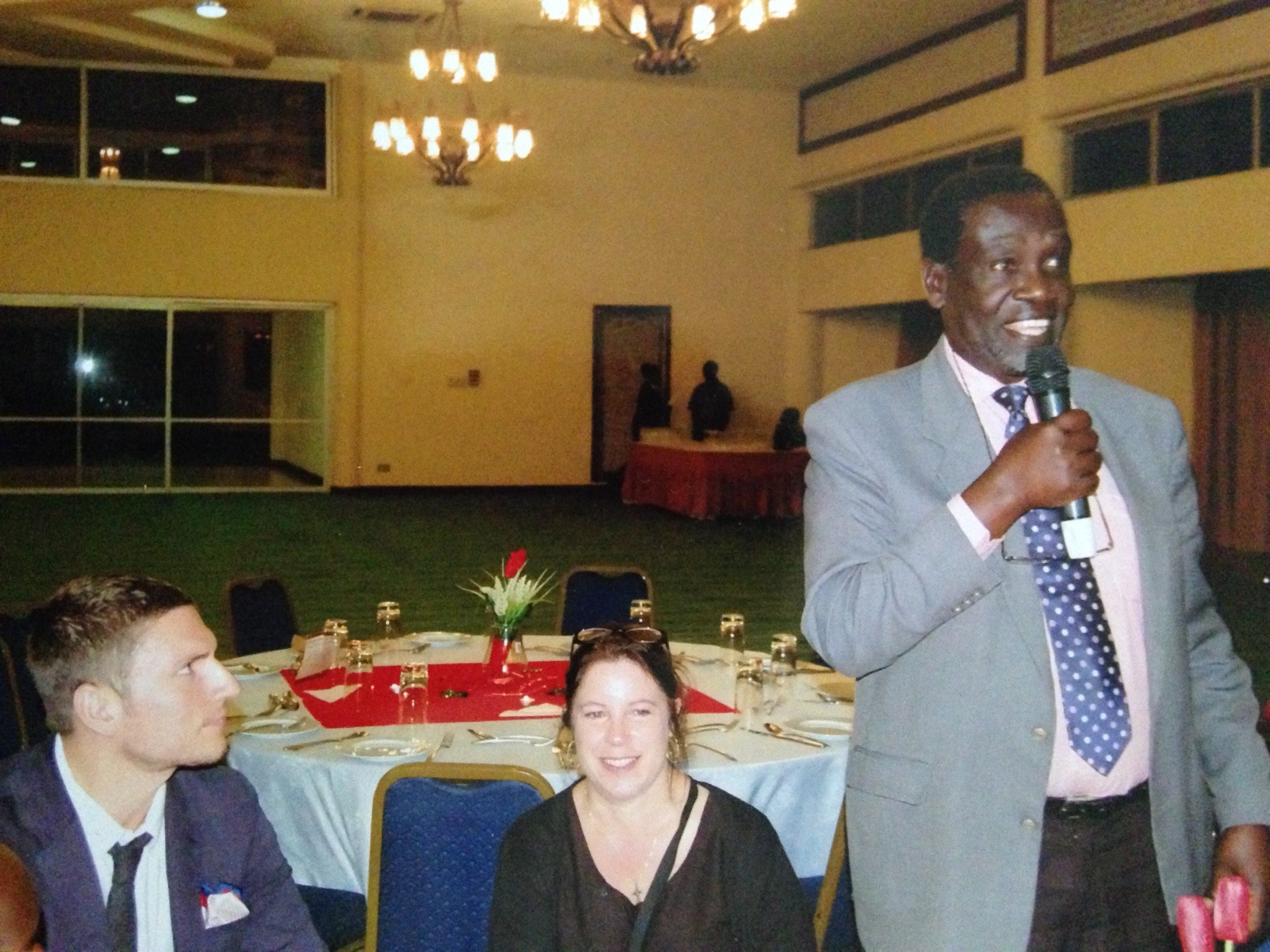 We decided to celebrate Joe’s last night in Kampala by going out to dinner but it turned out that the Makerere Nursing Program was also having a banquet that night to celebrate their 20th year of the program and the retirement of the Nursing Faculty member who started the program. So, Richard, the Professor of Pharmacy whom I work with, suggested we go out with Joe first and then all attend the Nursing celebration. Of course we were game for that plan but little did Joe and I know we were in for a real treat. The Nursing celebration was held at the Golf Club Hotel, which is quite nice, and consisted of a full evening of speeches and introductions and gift giving along with delicious food and wonderful conversations. There were several special guests including the Deputy Vice Chancellor of Makerere University and the Dean Emeritus of Nursing from Johns Hopkins University who had helped to start the program at Makerere 20 years ago. Although there was much formality with the introductions and the order of speakers, and the playing of the Uganda National Anthem, the atmosphere was like a big family party. Even though Joe and I don’t have a relationship with the Department of Nursing, we were warmly welcomed as if we were family.