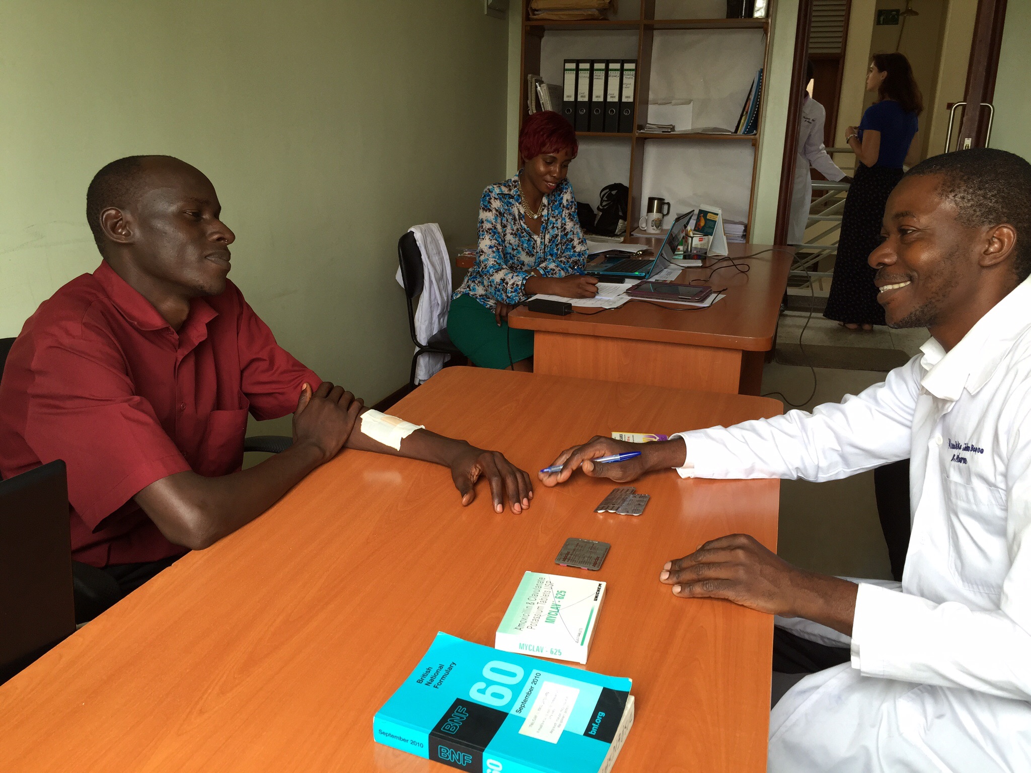 Yesterday Kristen had the opportunity to spend 5 hours with the pharmacy staff of the Infectious Disease Institute (IDI) in Kampala, on the campus of Mulago Hospital. Ever since I started coming to Uganda I have wondered about their activities. The only experience I’ve had so far is using their bathrooms- last fall I needed a facility and one of the interns said that she would take me to a bathroom. She said it was far, a long walk, but “believe me, it will be worth it”. Wow, she was right! Anyway, this trip I was able to get in touch with one of the IDI Pharmacists, she had emailed me to inquire about the Pharmaceutical Care Program I was advertising for (more on that later) and we started an email conversation that led to the opportunity for Kristen yesterday. I would have been there as well, but my energy was needed to prepare for the OSCE. When Kristen was done for the day at IDI, she was just glowing and couldn’t stop talking about all she had seen and learned. The IDI focuses on care for patients with HIV and AIDS. It is funded, at least in part, by the U.S. government. They do a lot of research to make sure patients are getting better with the current therapies and to make sure there aren’t drug interactions with antimalarials, which they actually have found a problem with some. Patients get all their HIV meds and visits for free. The pharmacists at IDI are really involved with both the research and monitoring patient safety with the drug therapy, called Pharmacovigilance. Since I couldn’t meet Eva and her crew earlier, we arranged to go to dinner at a lovely place called The Bistro. We had such a good time! Eva brought Julian, another pharmacist, and Shaida, a physician they work with. We had many laughs- Julian is so funny. Since we told him about the OSCE’s we were doing, he regaled us with his OSCE stories from his education at Makerere. Boy, after a number of year, he still remembers all of his mistakes. I’m sure he did well on many of the stations, but I guess what sticks in your mind are the times you messed up. It was a great evening and hopefully Wilkes students will be interested in working with the IDI pharmacists in the future.