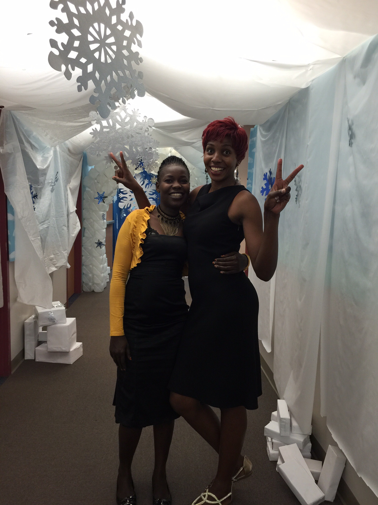 Gonsha and Cathy clowning around in the decorated hallway at St Luke Lutheran Church Vacation Bible School- the theme was Mount Everest so it was decorted like a snowy wonderland