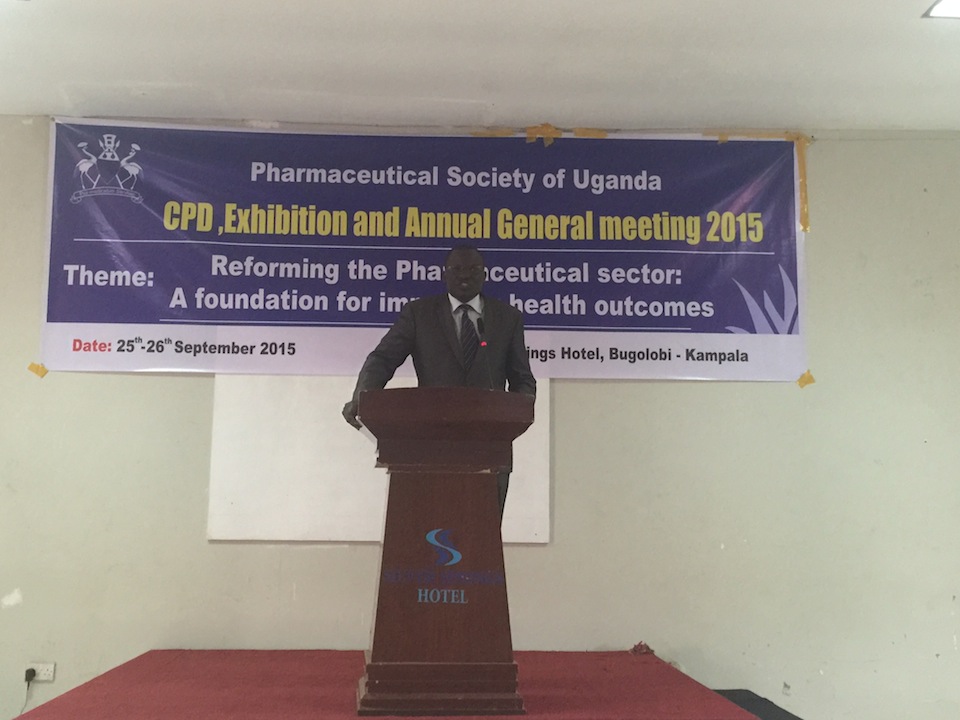 On Friday I had the pleasure of participating in the Annual General Meeting (AGM) of the Pharmaceutical Society of Uganda (PSU). This event draws 300-400 of all of the Pharmacists in Uganda (out of a total of 746 pharmacists) to a gathering where they spend 2 days together learning about everything from the State of Pharmacy Practice in the country to new regulations and laws being considered that affect them, to a synopsis of new taxation laws that affect pharmacists and pharmacy owners to issues of Pharmacovigilance (drug safety) and much more. I had attended a small part of this meeting back in 2013 to administer a survey on the state of Pharmaceutical Care (PC) I had developed with the Secretary of the PSU, Sam Opio, and a faculty member at Makerere University, Robert Otto. But this year, I was thrilled to be an invited speaker!