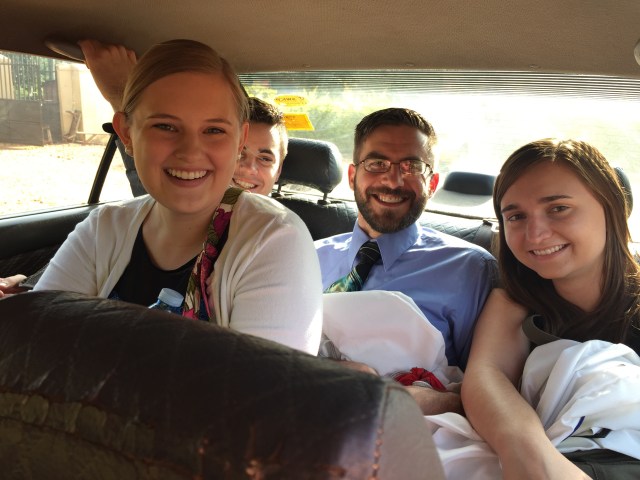 the ride to and from the clinic is loads of fun as all 4 students squish in the back of Sam’s sedan