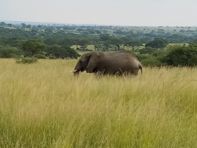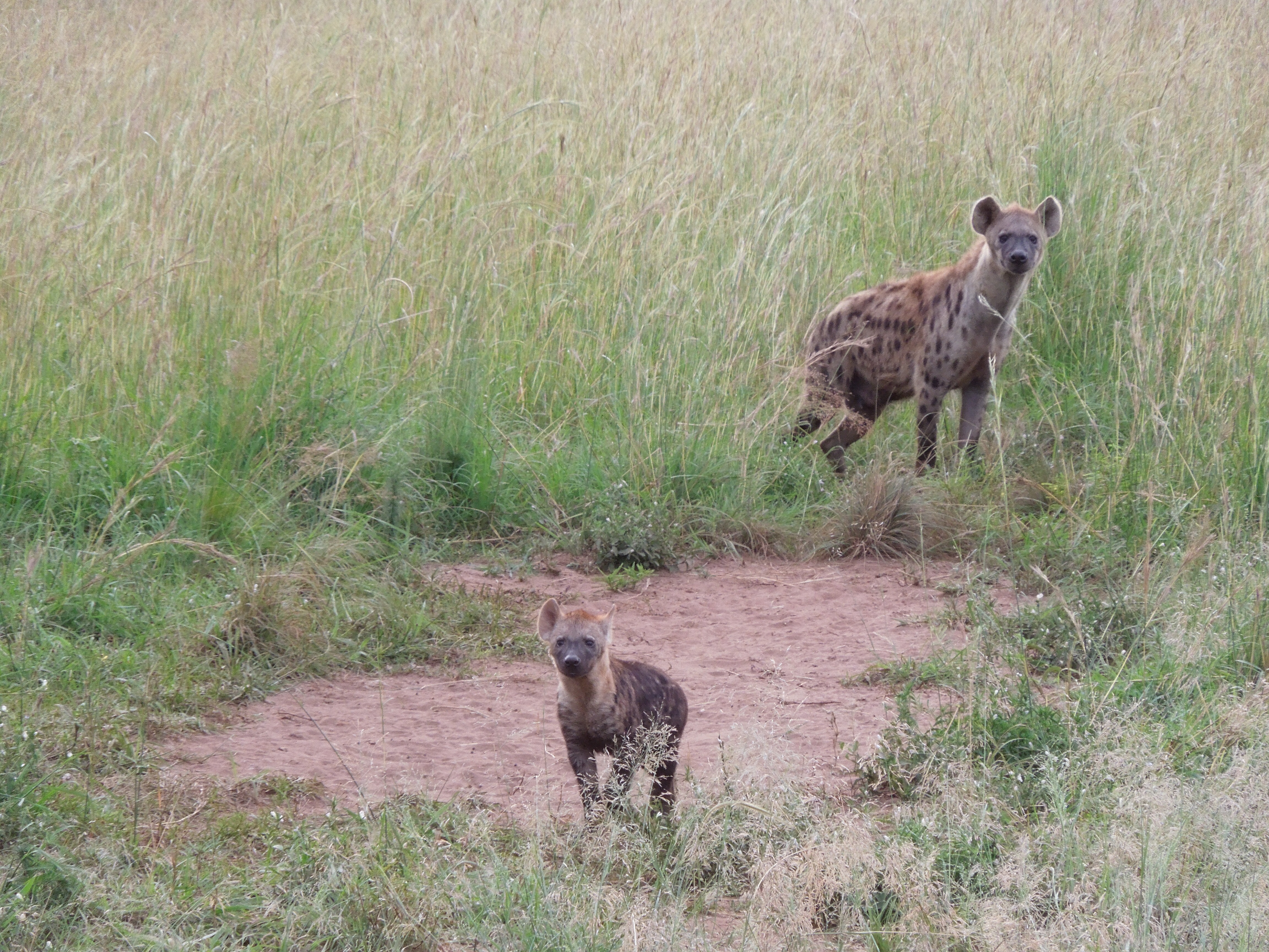 Someone noticed that the water buffalo (usually looking at us) were staring in a more distant area. That is when Mike saw something moving in the tall grass. Our guides identified it as a spotted leopard! The leopard was walking through the tall grass so we’d only get a periodic glimpse of his head, back and tail, but what treat! Later in the drive, we came across a lion the road! Again, a relatively rare find since lions don’t show themselves like the giraffes, antelopes and elephants. Later in the trip we came across a hyena just resting in an open area. After we watched him a bit, we were able to catch a glimpse of his mate and cub! So cool!